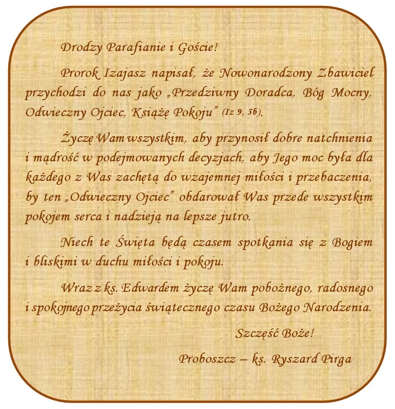 Dziękuję panu Organiście i chórzystom za upiększenie liturgii świątecznej kolędami i pastorałkami wykonanymi w naszej świątyni.