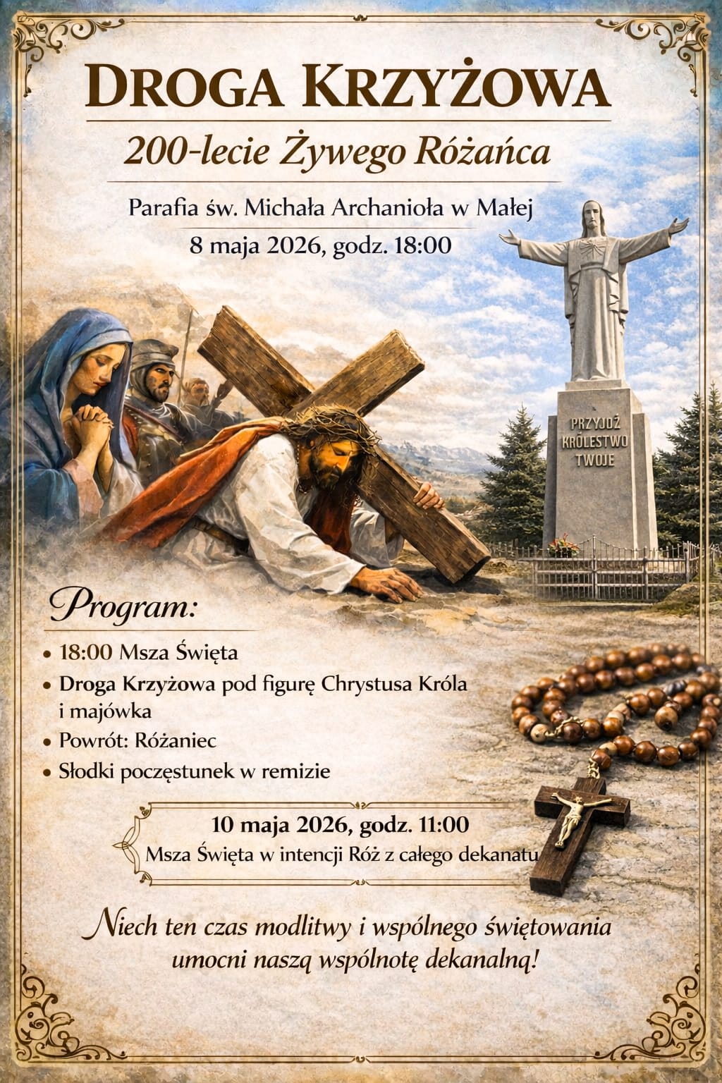 8 maja 2026 r. (piątek) o godz. 18:00 w naszej Parafii odbędzie się uroczysta Droga Krzyżowa, a po niej Różaniec z okazji 200-lecia Żywego Różańca.